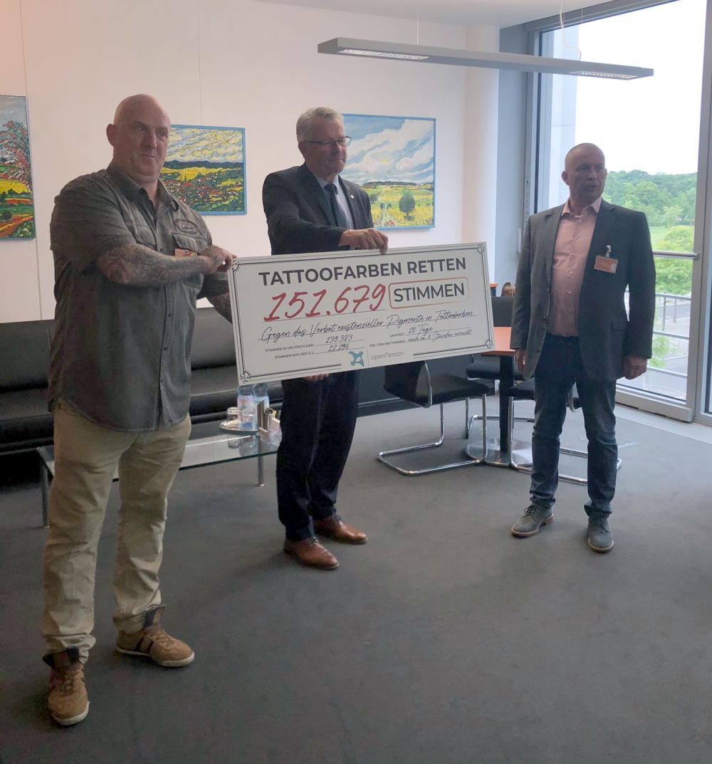 Berlin, 26.05.2020 - Initiator der Petition Jörn Elsenbruch und Dr. -Ing. Andreas Winkens, Wissenschaftlicher Beirat des Vereins Deutsche Organisierte Tätowierer trafen sich gestern mit Alois Gerig (CDU), dem Vorsitzenden des Ausschusses für Ernährung und Landwirtschaft. Sie haben die 151.679 Unterschriften übergeben, die sie im Rahmen der Petition #tattoofarbenretten auf openpetition.de gesammelt hatten. Die Onlinepetition richtet sich gegen das geplante Verbot von zwei wichtigen Farbpigmenten, die in zwei Drittel aller Tattoofarben enthalten sind.